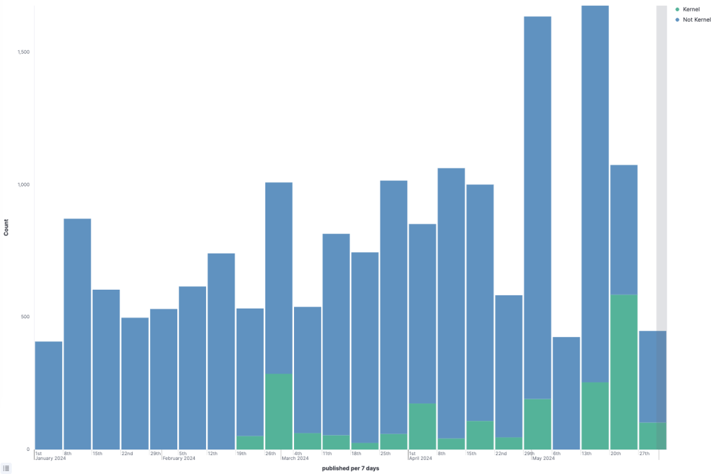 The green of the graph is Linux kernel CVE IDs, the blue is all other IDs. It’s a huge number. The kernel is pretty huge though, so these numbers shouldn’t be unexpected.