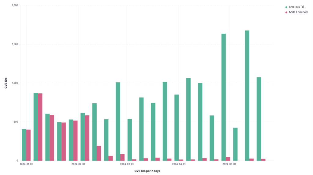 One of the more exciting events this year was in February when NVD stopped enriching vulnerabilities. We can see from this graph is dropped off pretty abruptly. This dropoff was unexpected and didn’t come with any sort of explanation for many weeks.