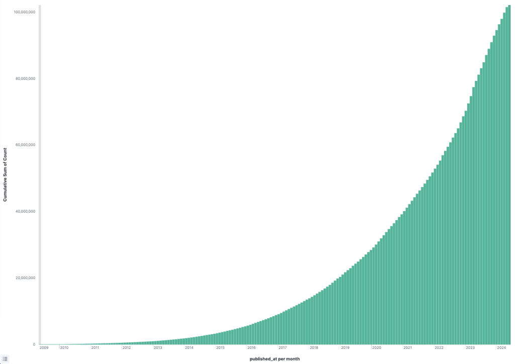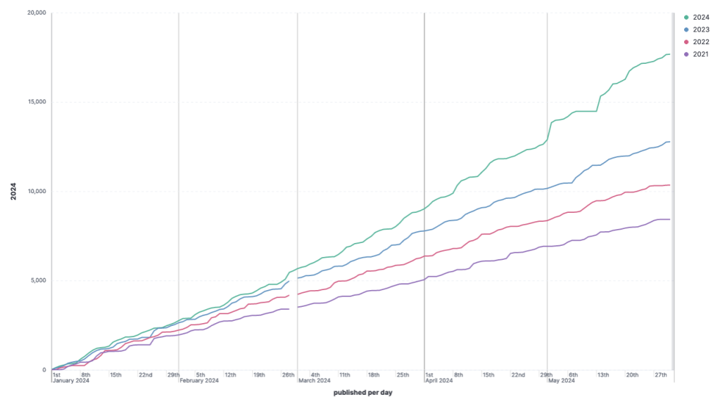 The first and most important thing to understand is the sheer size of CVE today. If we graph the CVE IDs since January 1 of their respective years to the time of this writing, we can see the current rate of growth